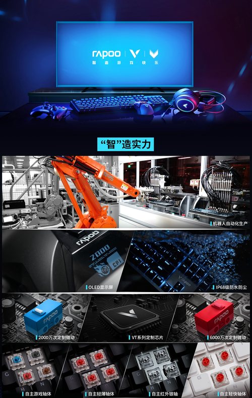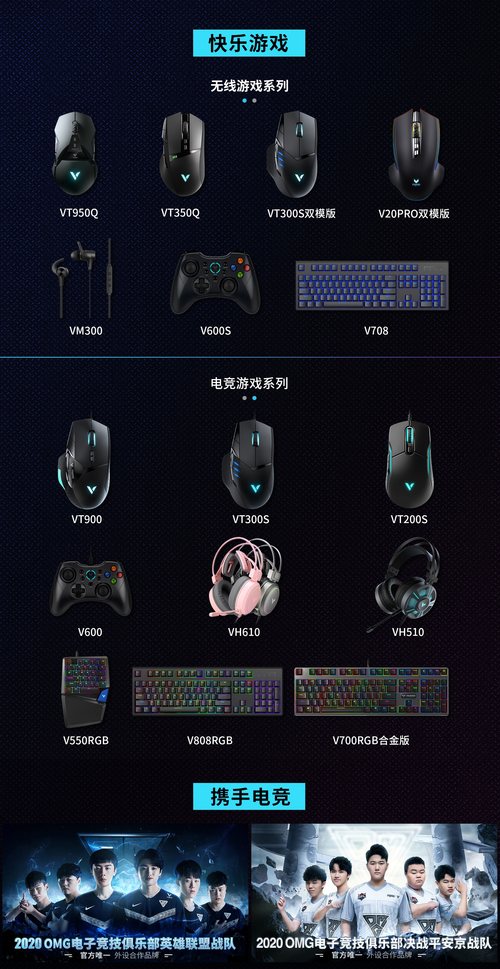 雷柏游戏-智造游戏快乐 Rapoo雷柏,成立于2002年,外设行业上市公司,国家级高新技术企业,首批国家智能制造试点示范企业。 雷柏游戏外设,2008年推出首款游戏产品,迄今已成功打造高端电竞VT与游戏V两大系列,涵盖游戏鼠标、游戏键盘、游戏耳机、游戏手柄等多个品类产品。雷柏以技术研发为核心,以市场需求为指引,以用户体验为宗旨,凭借新科技、新功能、新造型、性价比优势,成功带动了游戏外设的普及浪潮。 雷柏拥有雄厚的研发实力,自主研发、定制雷柏轴体、雷柏微动、VT专属芯片等核心产品部件。Qi无线充电、OLED显示屏、IP68级防水防尘、板载内存、云端存储等功能,将设计与性能融入产品,成为专业电竞级玩家的首选。 PC电竞、手游电竞,雷柏游戏全面携手电竞各领域,先后与电竞战队(皇族、GT、OMG、AS仙阁、GK)、电竞明星(Miss韩懿莹、Misaya若风禹景曦)、电竞赛事(NEST、IET)、电竞教育(FFF培训基地)都展开过深度合作,共同推动电竞文化发展。此外,雷柏游戏与职业选手深度探讨更为出色的操控反馈,陆续联手推出过Uzi定制版、Zhou定制版、Miss定制版、OMG战队定制版等多款专属外设产品,用中国“智”造,与快乐同行,追逐坚持的,探索热爱的,助力玩家随时开秀。 2020年,雷柏将继续以一贯的高标准、高品质、强设计、强应用要求,立足当下,打破局限,为玩家专业护航,奉上更多新奇有趣的游戏产品,拓展游戏场景应用,重新定义个性化的游戏体验。
